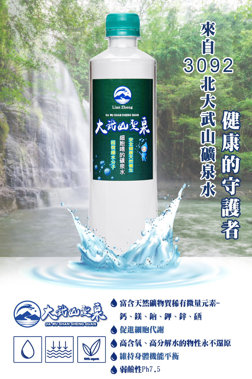 源自自然的至臻之禮在那雲霧繚繞的大武山中隱藏著一處,宛如仙境的寶藏大武山天然湧泉。這裡的湧泉彷彿是大自然用最細膩的筆觸精心雕琢而成。它從大武山深處的岩層中緩緩湧出,歷經漫長歲月的洗禮,帶著大地的溫度和靈氣一路奔騰而來。每一滴「大武山聖泉」超微細天然礦泉水,為讓消費者在飲用時能盡速有效感受到對身體健康的幫助,都如同一個微小的水靈蘊含著豐富的礦物質及微量元素,這些礦物質是大自然賦予他的獨特印記,也是它能夠滋養生命,喚活身心的秘密武器。無論是在炎炎夏日裡消暑解渴,還是在疲憊時滋潤身心,「大武山聖泉」超微細天然礦泉水都能帶給你無與倫比的enjoy。它不僅是一瓶水,更是大自然對我們的饋贈,是我們與自然和諧共生的最佳見證,這就是「超微細小分子水」優於其它品牌礦泉水最真實的證明。